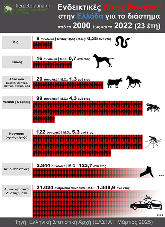 Στην Ελλάδα δεν έχει καταγραφεί θάνατος από δάγκωμα οχιάς τα τελευταία χρόνια. Όπως φαίνεται στον παρακάτω πίνακα από το εγχειρίδιο του βιολόγου-ερπετολόγου, σε ένα διάστημα 23 ετών (2000-2022) καταγράφηκαν 8 θάνατοι από δάγκωμα φιδιού. Διπλάσιος αριθμός ανθρώπων (16) πέθανε στο ίδιο διάστημα από δάγκωμα σκύλου, άλλοι 29 από άλλο ζώο, 99 από μέλισσες και σφήκες, και 122 από ιογενείς λοιμώξεις που μεταφέρθηκαν από τσίμπημα κουνουπιού.