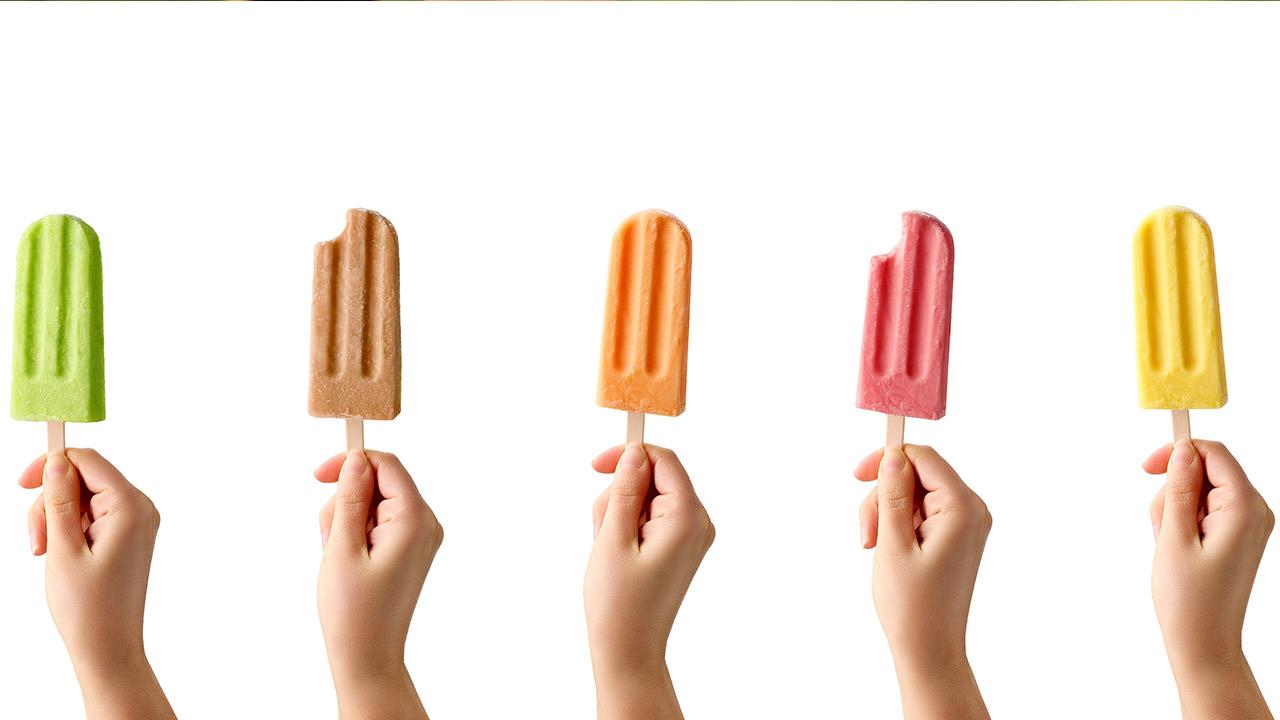 Σε 3 μπολάκια, βάλτε από 1 φλιτζάνι πουρέ του κάθε φρούτου. Σε κάθε μπολ προσθέστε: ¾ φλ. νερό, 1 κ.σ. ζάχαρη και 1 κ.σ. χυμό λάιμ. Ανακατέψτε καλά. Μοιράστε το κάθε μείγμα σε 4 καλούπια (ή ποτηράκια) και προσθέστε τα ξυλάκια.