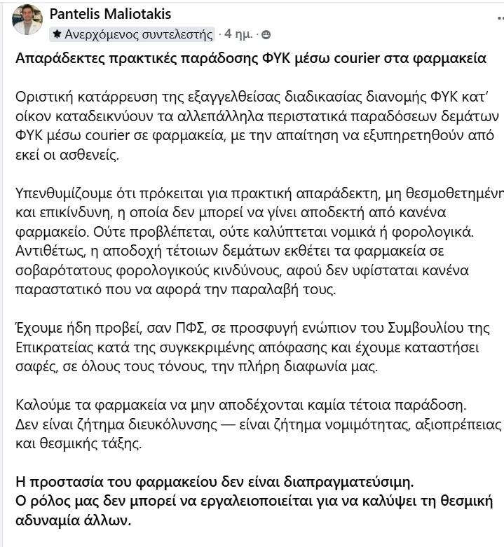 Καλούμε τα φαρμακεία να μην αποδέχονται καμία τέτοια παράδοση. Δεν είναι ζήτημα διευκόλυνσης - είναι ζήτημα νομιμότητας, αξιοπρέπειας και θεσμικής τάξης. Η προστασία του φαρμακείου δεν είναι διαπραγματεύσιμη. Ο ρόλος μας δεν μπορεί να εργαλειοποιείται για να καλύψει τη θεσμική αδυναμία άλλων".