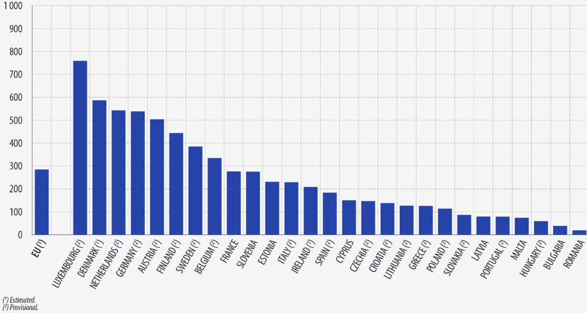 Οι υψηλότερες κατανομές μεταξύ των χωρών της ΕΕ καταγράφηκαν στο Λουξεμβούργο (759,2 € ανά άτομο), ακολουθούμενες σε κάποια απόσταση από τη Δανία (586,8 €) και την Ολλανδία (542,7 €).