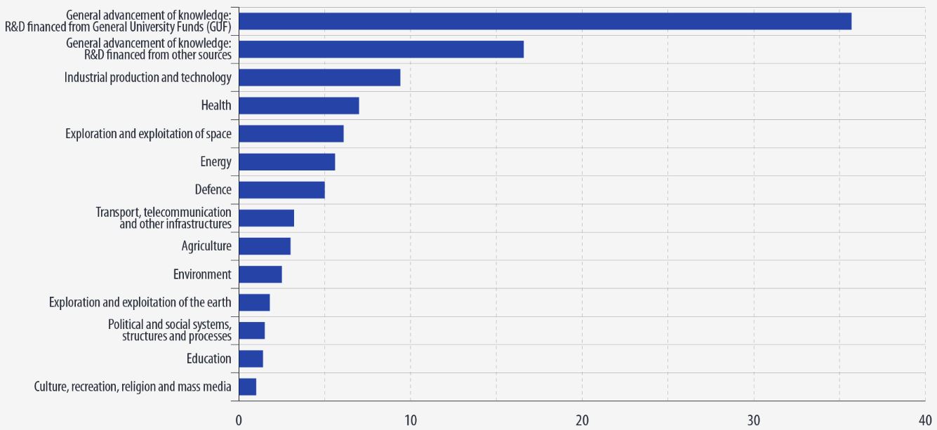 Χρηματοδοτήθηκαν κυρίως τα δημόσια γενικά πανεπιστημιακά ταμεία. Το 16,6% διατέθηκε για τη γενική προώθηση της γνώσης, το 9,4% για τη βιομηχανική παραγωγή και τεχνολογία, το 7% για την Υγεία και το 6,1% για την εξερεύνηση και αξιοποίηση του διαστήματος.
