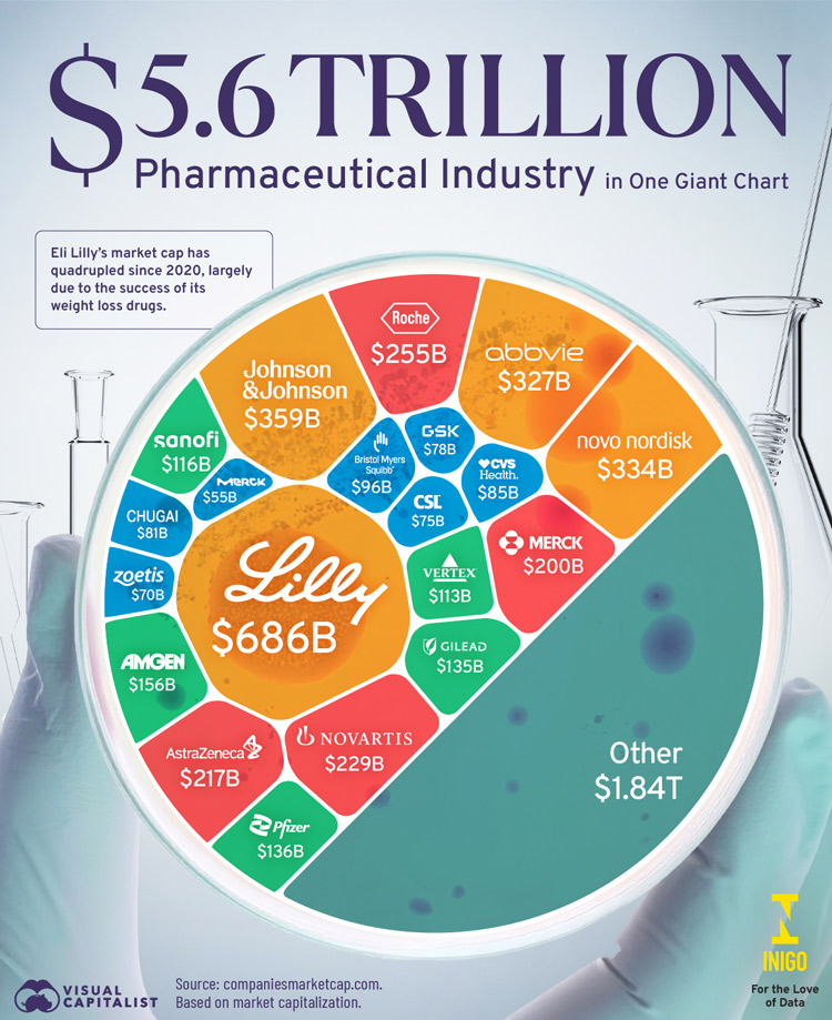 Η Eli Lilly κυριαρχεί στον κλάδο με μια εκπληκτική κεφαλαιοποίηση ύψους 686 δισ. δολ., σχεδόν διπλάσια από αυτήν της Johnson & Johnson, της δεύτερης μεγαλύτερης εταιρείας, των 359 δισ. δολ. Η αξία της Eli Lilly έχει εκτοξευθεί από το 2020, από περίπου 130 δισ. δολ. τροφοδοτούμενη σε μεγάλο βαθμό από την ραγδαία επιτυχία των φαρμάκων για την απώλεια βάρους, των Mounjaro και Zepbound.
