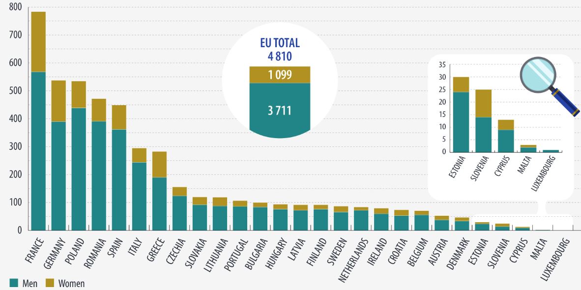 Ωστόσο, στη Σλοβενία (14 άνδρες, 11 γυναίκες), η διαφορά ήταν λιγότερο σημαντική από ό,τι σε άλλες χώρες της ΕΕ. Στο Λουξεμβούργο, το μόνο θύμα ήταν άνδρας.