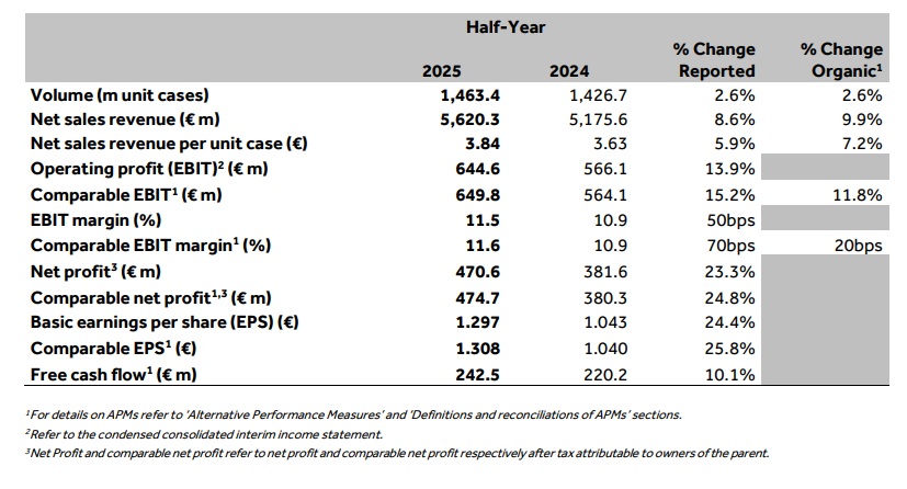 - Οργανικός όγκος αυξήθηκε κατά 2,6%, με ώθηση από τα ανθρακούχα (+2,3%) και τα ενεργειακά ποτά (+30,0%), με ιδιαίτερη δύναμη στις αναδυόμενες αγορές· οι όγκοι του β’ τριμήνου βελτιώθηκαν στο +3,2%, με συνεισφορά από όλα τα τμήματα