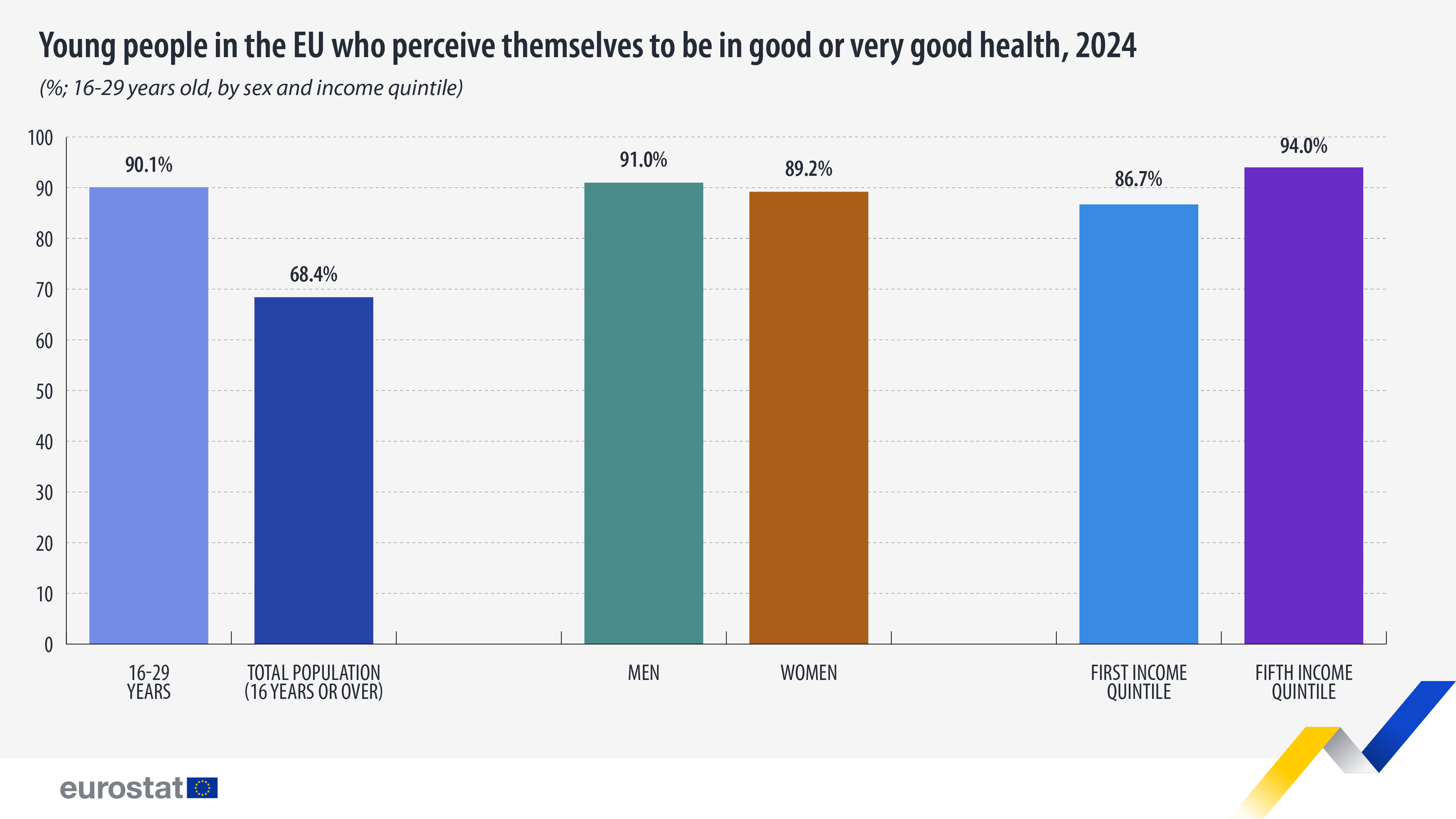 Το 2024, ποσοστό 90.1% νέων ανθρώπων στην Ε.Ε, ηλικίας 16 - 29 ετών θεωρούσαν ότι έχουν καλή ή πολύ καλή υγεία. Το ποσοστό είναι σημαντικά υψηλότερο από αυτό του γενικού πληθυσμού πάνω από 16 ετών (68,4%).