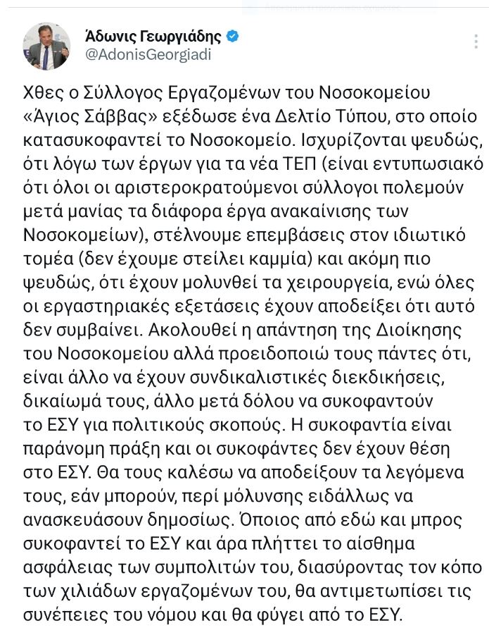 Σημειώνεται πως ήταν τόσο μεγάλη η προπαγανδιστική πρεμούρα του κ. Γεωργιάδη που στην σχετική ανάρτηση ψεύδεται ακόμα και για τον… χώρο όπου γίνονται εργασίες διαδίδοντας πως δήθεν "κατασκευάζεται νέο Τμήμα Επειγόντων Περιστατικών - ΤΕΠ" αντί για το αληθές που είναι ανακαίνιση του χώρου των χειρουργείων.