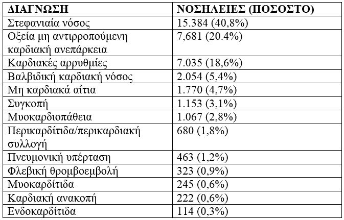 Οι κυριότερες πρωτογενείς διαγνώσεις ήταν η στεφανιαία νόσος (40,8% του συνόλου), η οξεία μη αντιρροπούμενη καρδιακή ανεπάρκεια (20,4%) και οι αρρυθμίες (18,6%). Όλες οι διαγνώσεις, ο αριθμός των νοσηλειών και τα ποσοστά επί του συνόλου παρατίθενται αναλυτικά στον παρακάτω πίνακα: