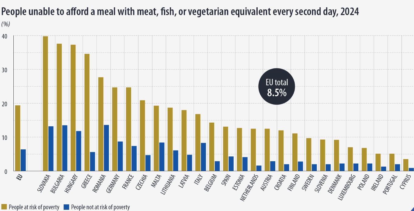 Σε εθνικό επίπεδο, το υψηλότερο ποσοστό ατόμων που κινδυνεύουν από φτώχεια και δεν μπορούν να αντέξουν οικονομικά ένα σωστό γεύμα καταγράφηκε στη Σλοβακία (39,8%), ακολουθούμενη από τη Βουλγαρία (37,7%) και την Ουγγαρία (37,3%).