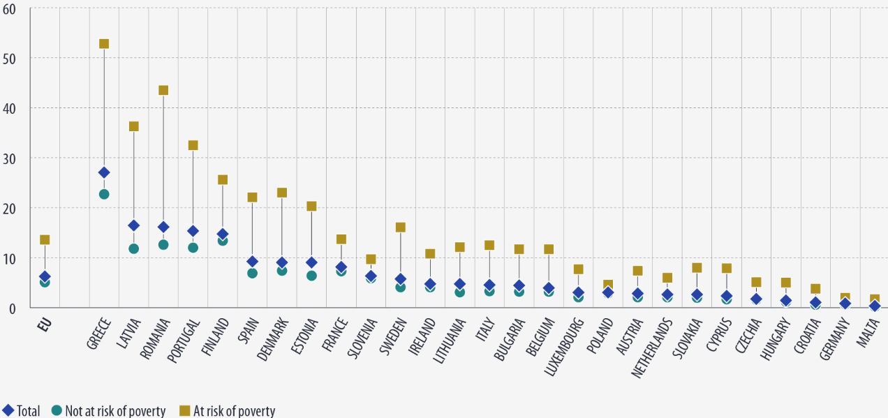 Εκτινάσσεται, δε, στο 52,8% σε άτομα και νοικοκυριά που βρίσκονται κάτω στα όρια της φτώχειας (13,7% το μέσο ευρωπαϊκό ποσοστό.