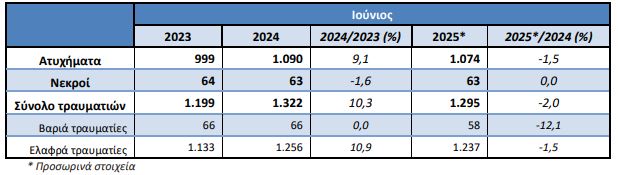 Σύμφωνα με τους συντάκτες της, τα τροχαία ατυχήματα, που συνέβησαν τον Ιούνιο σε ολόκληρη τη Χώρα και προκάλεσαν τον θάνατο ή τον τραυματισμό ατόμων, μειώθηκαν κατά 1,5% σε σύγκριση με τον αντίστοιχο μήνα του 2024 (1.074 τον Ιούνιο του 2025, έναντι 1.090 τον Ιούνιο του 2024).