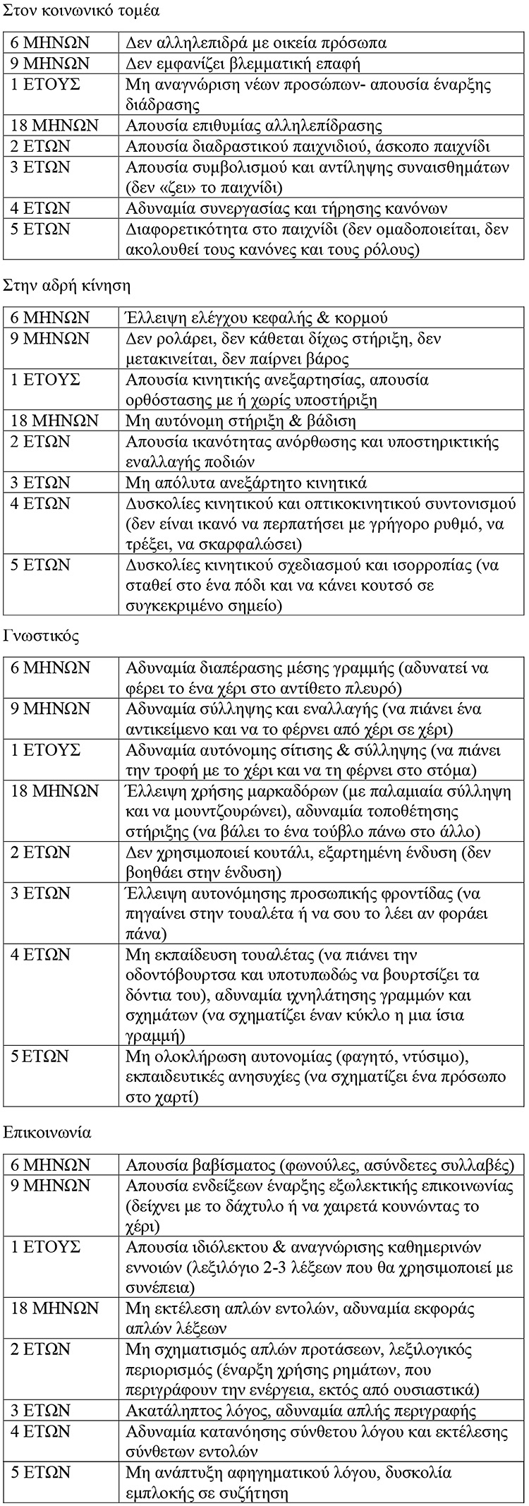 Στους παρακάτω πίνακες παρουσιάζονται συνοπτικά οι ενδείξεις απόκλισης από τα αναπτυξιακά ορόσημα, ανά τομέα και ανά ηλικία, που μπορεί να εγείρουν red flags για πρώιμη παρέμβαση.
