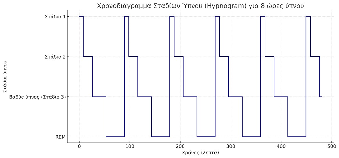 Αυτός ο κύκλος (90 λεπτά) επαναλαμβάνεται 4 - 6 φορές στη διάρκεια της νύχτας. Στην αρχή κοιμόμαστε πιο βαθιά, ενώ προς το πρωί κυριαρχεί ο REM ύπνος με περισσότερα όνειρα (Πίνακας 1).