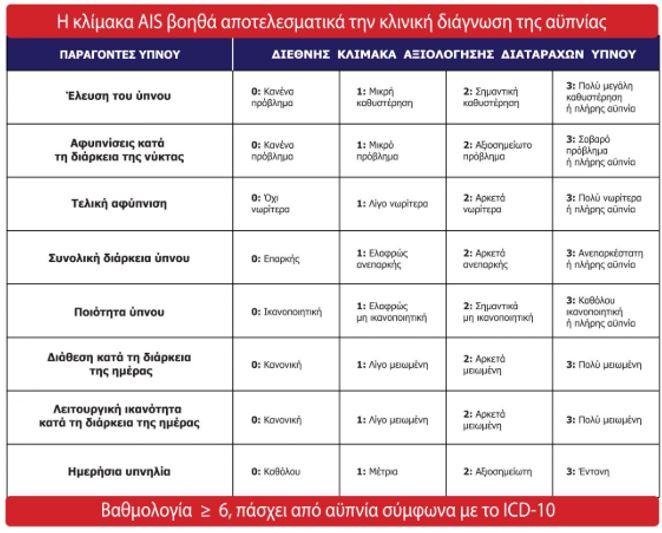 H Κλίμακα Αϋπνίας Αθηνών (AIS), χρησιμοποιείται ευρέως στην ιατρική σαν μια μέθοδος μέτρησης της αϋπνίας. Η μέτρηση πραγματοποιείται με εκτίμηση οκτώ παραγόντων (όπως συνοψίζονται παρακάτω), πέντε πρώτους που σχετίζονται με τον νυχτερινό ύπνο και τρεις που σχετίζονται με τη δυσλειτουργία του οργανισμού κατά τη διάρκεια της ημέρας ( Soldatos et al., 2000).