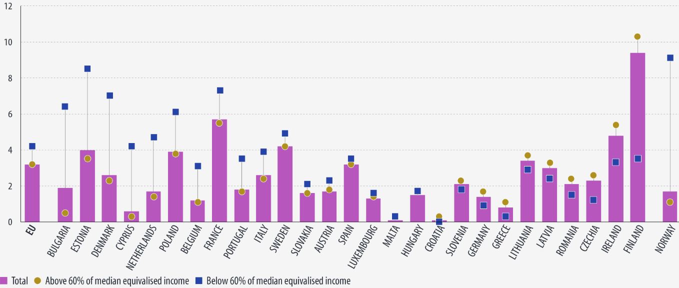 Ωστόσο, σε 10 χώρες της ΕΕ αυτό το ποσοστό ήταν χαμηλότερο για τα παιδιά που ζουν σε νοικοκυριά κάτω από το όριο κινδύνου φτώχειας, με τη μεγαλύτερη διαφορά προς αυτή την κατεύθυνση να παρατηρείται στη Φινλανδία.