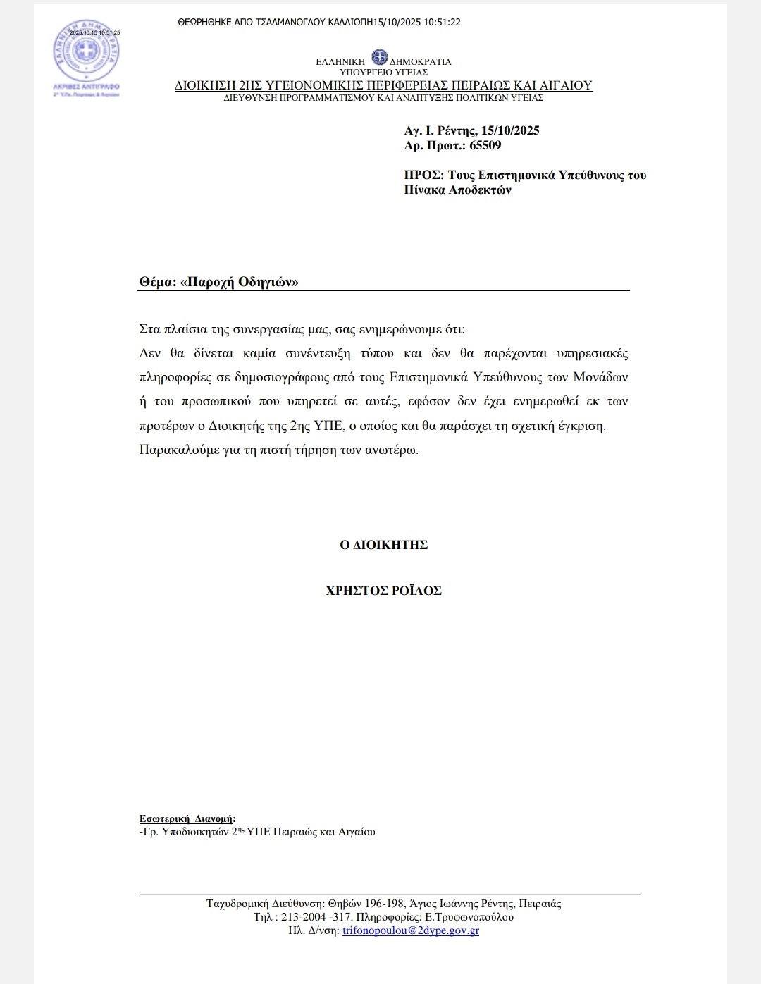 Στο έγγραφο, που παρατίθεται πιο κάτω και υπογράφει ο διοικητής Χρήστος Ροϊλός, αναφέρεται πως "δεν θα δίνεται καμία συνέντευξη τύπου και δεν θα διατίθενται υπηρεσιακές πληροφορίες σε δημοσιογράφους από Επιστημονικά Υπεύθυνους των Μονάδων ή του προσωπικού που υπηρετεί σε αυτές, εφόσον δεν έχει ενημερωθεί εκ των προτέρων ο διοικητής της 2ης ΥΠΕ, ο οποίος θα παράσχει και τη σχετική έγκριση. Παρακαλούμε για την πιστή τήρηση των ανωτέρω".
