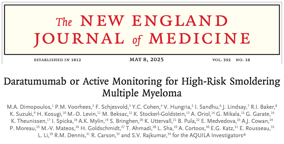 Η μελέτη συνέκρινε την υποδόρια χορήγηση daratumumab ως μονοθεραπεία για 36 μήνες με την ενεργό παρακολούθηση σε ασθενείς με ασυμπτωματικό μυέλωμα υψηλού κινδύνου και απέδειξε ότι η θεραπεία μειώνει κατά 51% τον κίνδυνο εξέλιξης σε συμπτωματική νόσο ή θάνατο. Πέντε χρόνια μετά την έναρξη της μελέτης, το 63,1% των ασθενών που έλαβαν daratumumab παρέμεναν χωρίς εξέλιξη, έναντι 40,8% στην ομάδα παρακολούθησης.