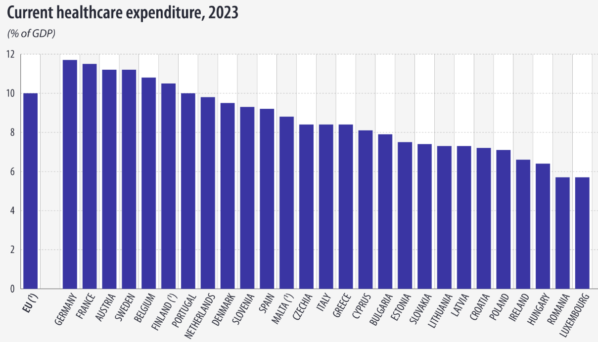 Η Γερμανία κατέγραψε το υψηλότερο επίπεδο τρεχουσών δαπανών για την υγειονομική περίθαλψη μεταξύ των χωρών της ΕΕ, αξίας 492 δισεκατομμυρίων ευρώ το 2023, ακολουθούμενη από τη Γαλλία (325 δισεκατομμύρια ευρώ), την Ιταλία (179 δισεκατομμύρια ευρώ) και την Ισπανία (138 δισεκατομμύρια ευρώ).