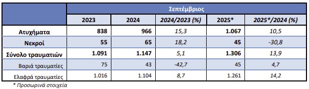 Αύξηση κατά 13,9% σημειώθηκε τον Σεπτέμβριο στους τραυματισμούς από τροχαία ατυχήματα.