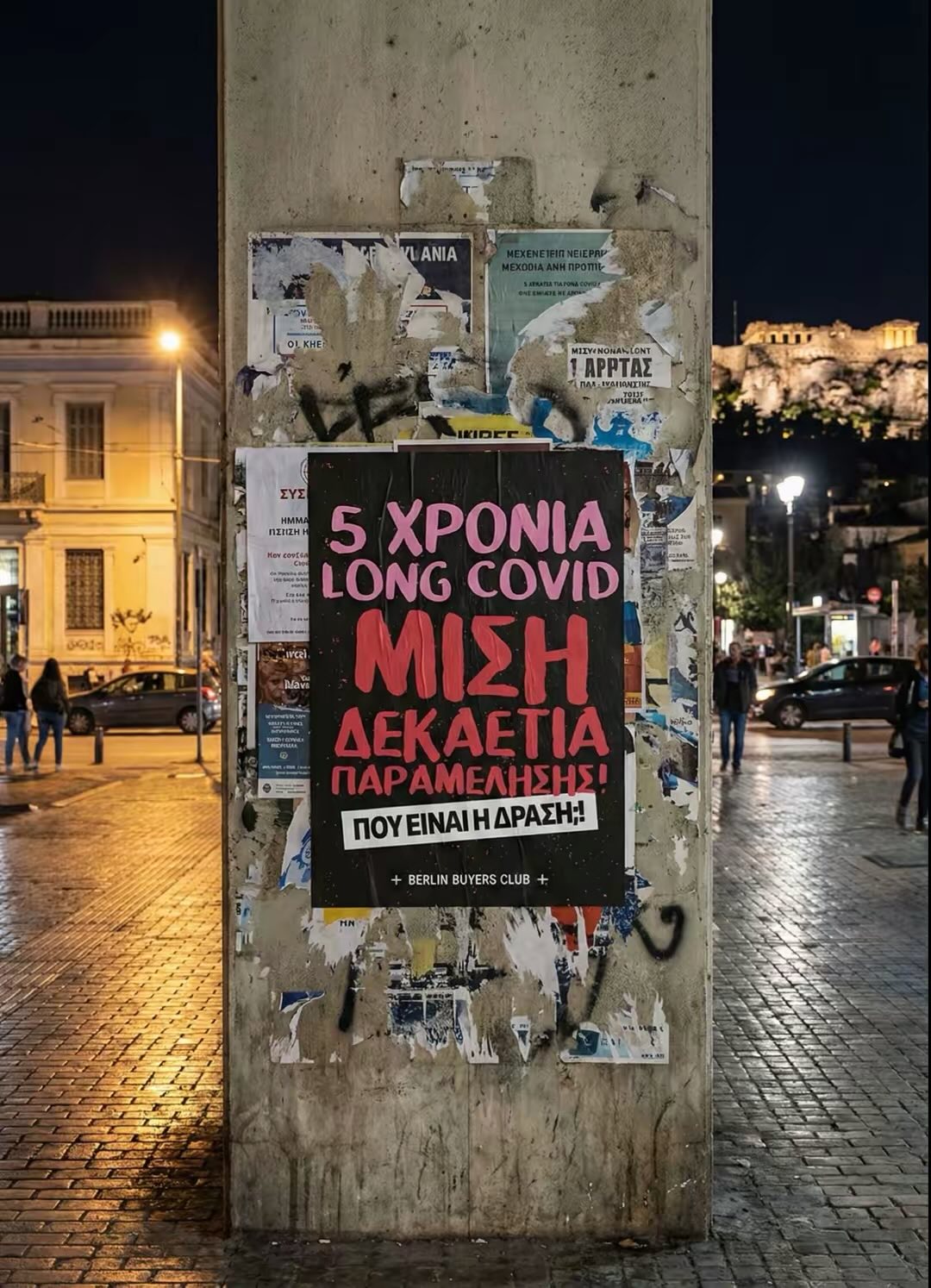 "Πέντε χρόνια Long COVID - Μισή δεκαετία παραμέλησης". "Η ιατρική αμέλεια δεν αποτελεί θεραπεία". "Το ME/CFS σκοτώνει". Τα συνθήματα αυτά, τυπωμένα σε αφίσες διαμαρτυρίας με την υπογραφή "Berlin Buyers Club", έκαναν την εμφάνισή τους τις τελευταίες ημέρες στο κέντρο της Αθήνας.