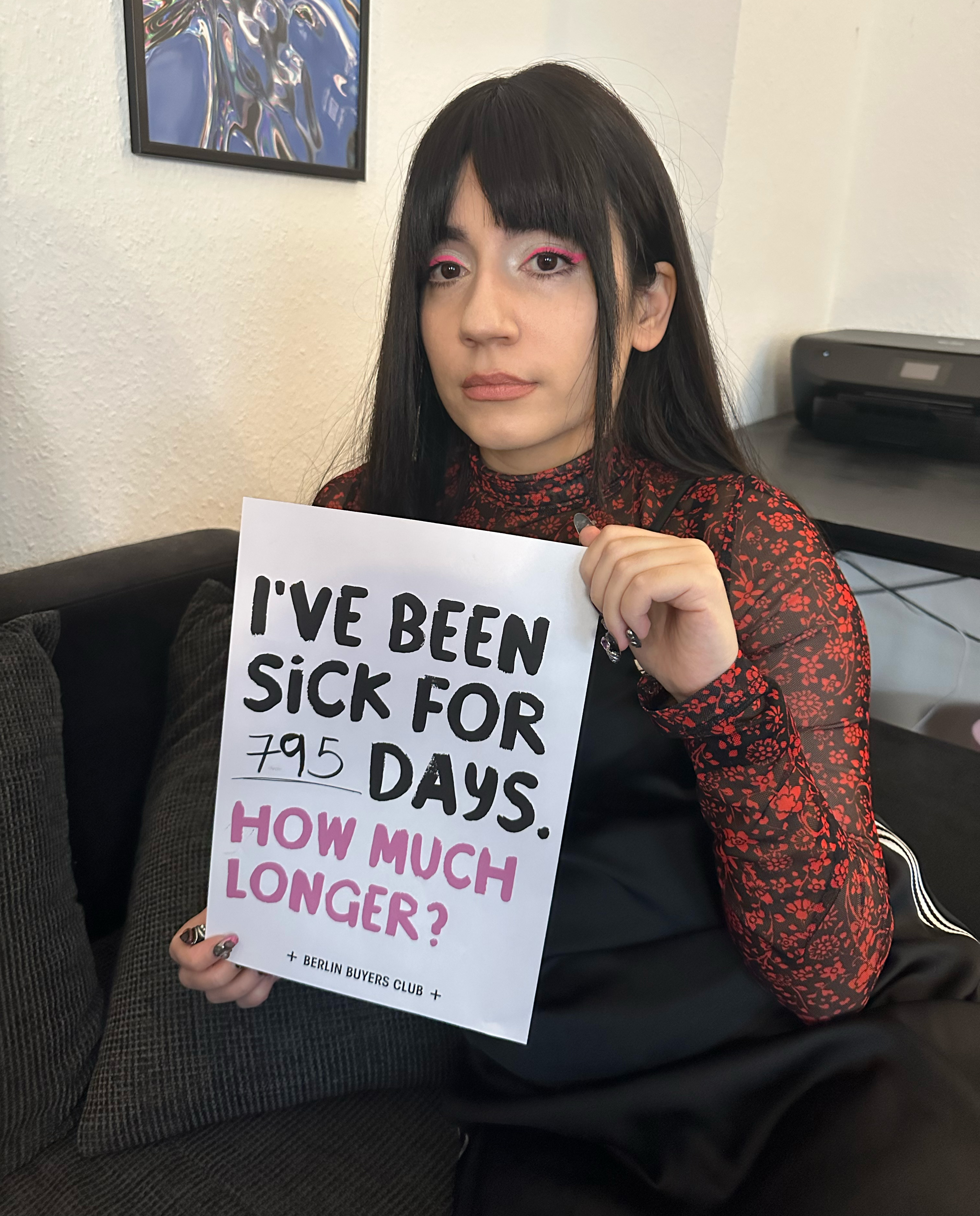 Οι αφίσες σχεδιάστηκαν στο Βερολίνο, από τη Σόφη Δημητρίου (φωτογραφία), μια νεαρή γραφίστρια με ελληνικές ρίζες, ασθενή με Long COVID. Berlin Buyers Club ονομάζεται η ακτιβιστική συλλογικότητα που ίδρυσε η ίδια, με σκοπό αυξηθεί η ενημέρωση και ευαισθητοποίηση του κοινού για τη μακρά COVID και το ME/CFS (Μυαλγική Εγκεφαλομυελίτιδα/Σύνδρομο Χρόνιας Κόπωσης).