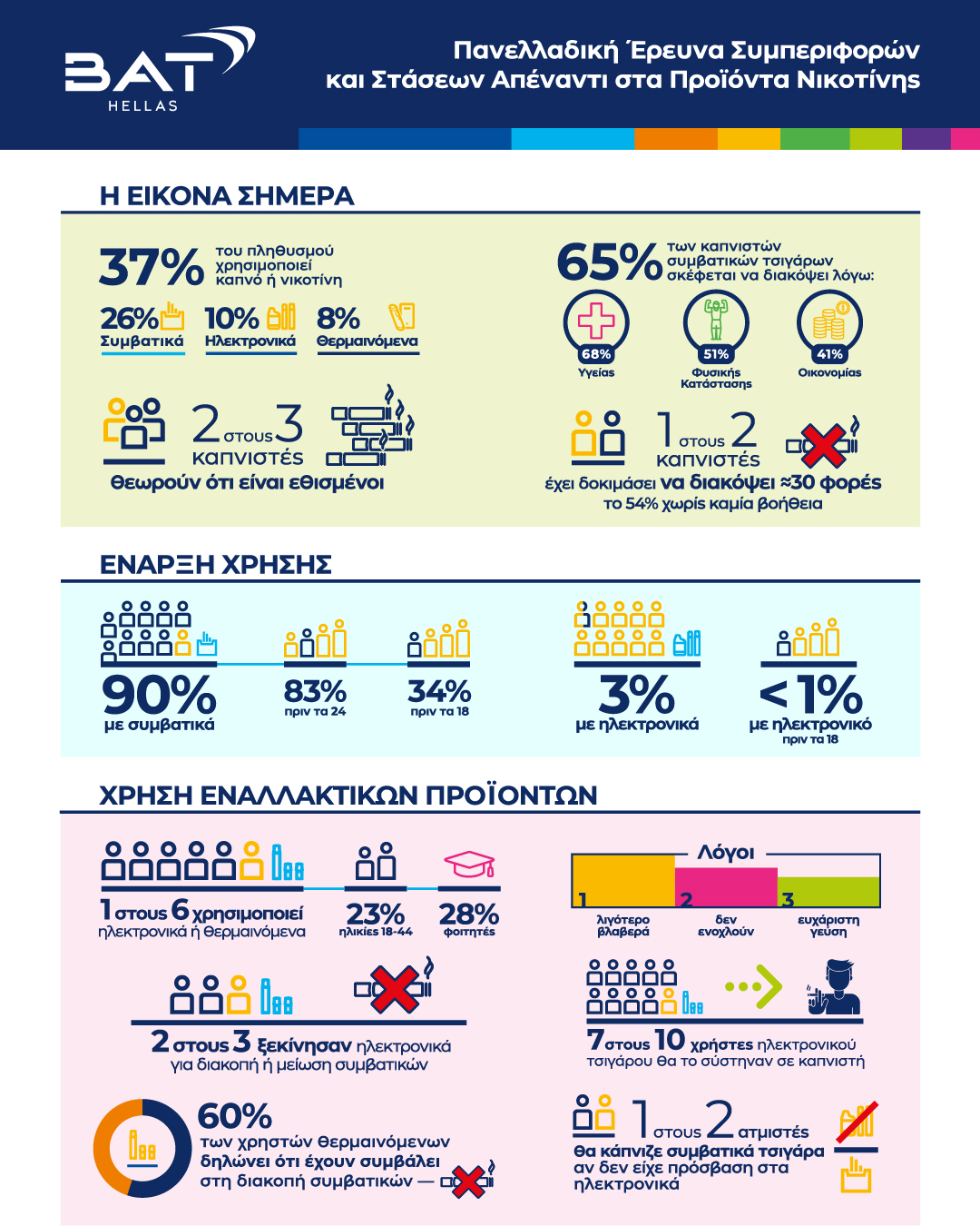 Τα δεδομένα αυτά υπογραμμίζουν την ανάγκη ενίσχυσης πολιτικών πρόληψης και μεγαλύτερης εστίασης στις νεότερες ηλικίες, και επιβεβαιώνουν πως η πρόσφατη νομοθετική απαγόρευση πώλησης προϊόντων καπνού και αλκοόλ σε άτομα κάτω των 18 ετών και η αυστηροποίηση των κυρώσεων για τους παραβάτες από το Υπουργείο Υγείας είναι υψίστης σημασίας για την προστασία της νέας γενιάς και την καλλιέργεια κουλτούρας μη-καπνιστών στη χώρα.