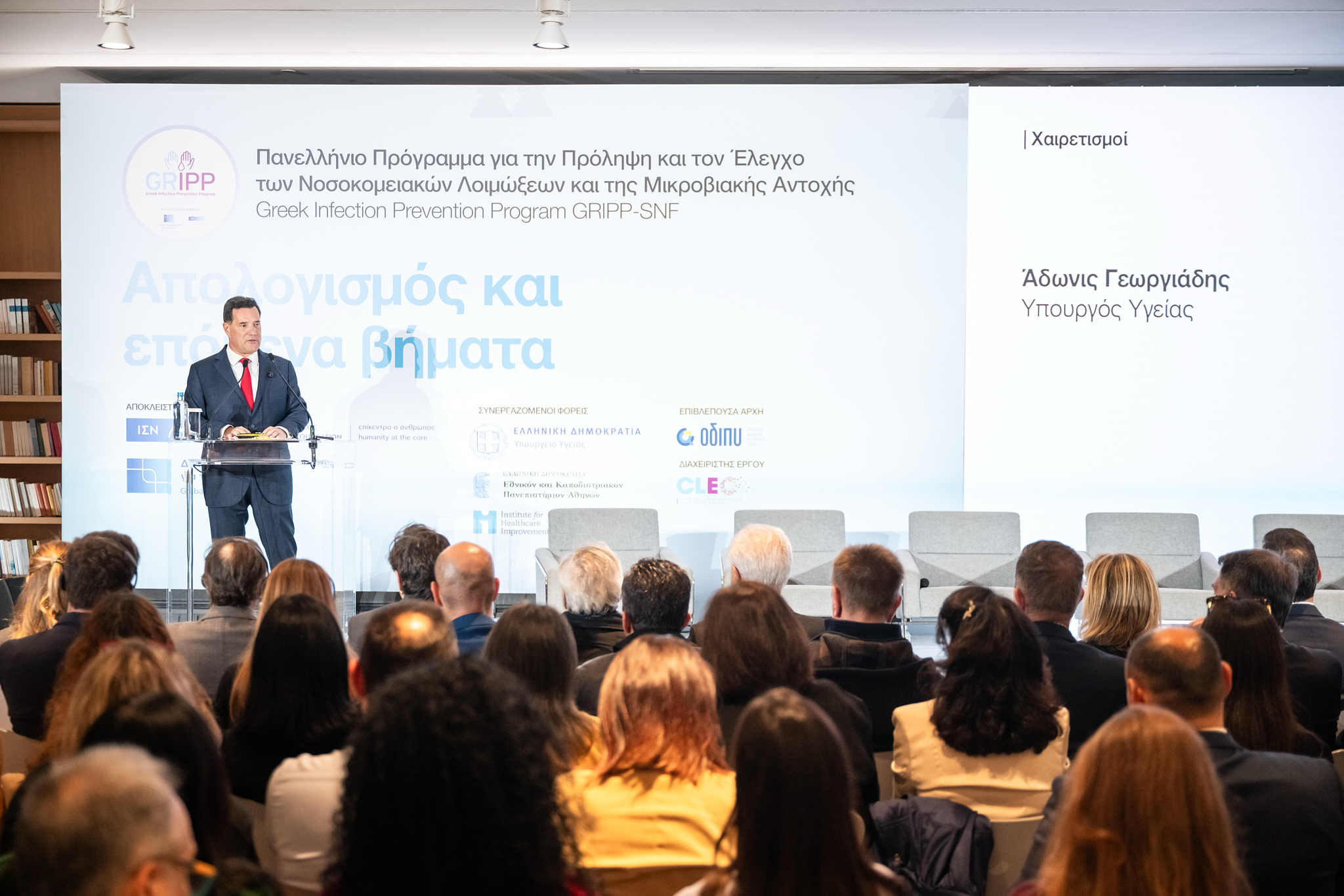 Στην εκδήλωση χαιρετισμό απηύθυναν ο Υπουργός Υγείας, Άδωνις Γεωργιάδης και ο Υφυπουργός Υγείας, Μάριος Θεμιστοκλέους, οι οποίοι υπογράμμισαν τη σημασία του GRIPP-SNF για την ασφάλεια των ασθενών και την αντιμετώπιση της μικροβιακής αντοχής, παρουσιάζοντας μετρήσιμα αποτελέσματα και τον οδικό χάρτη επέκτασης του προγράμματος στο Εθνικό Σύστημα Υγείας.