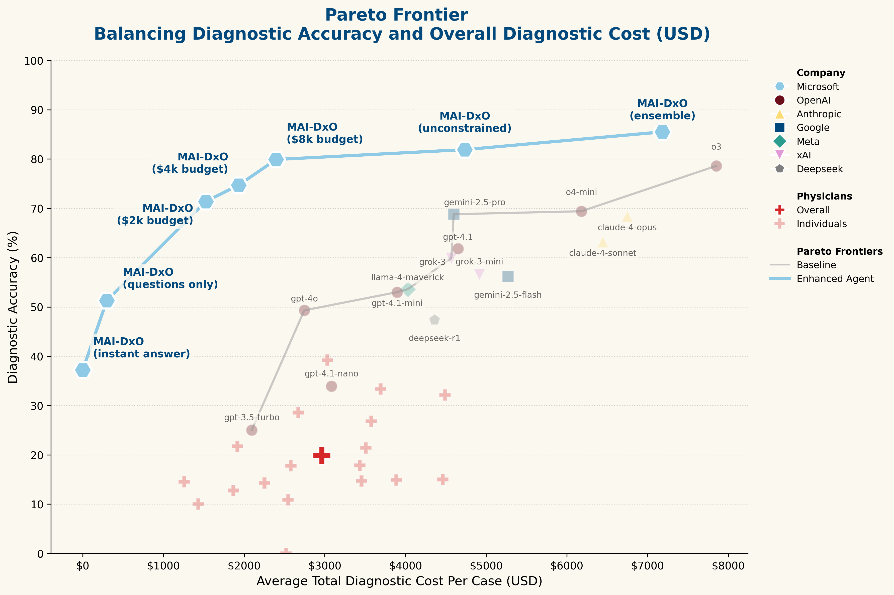 Έγινε μεγάλος ντόρος όταν η Microsoft παρουσίασε την εντυπωσιακή διαγνωστική ικανότητα του συστήματος Microsoft AI Diagnostic Orchestrator (MAI-DxO) το οποίο πέτυχε 85,5% ακρίβεια διάγνωσης σε δύσκολα περιστατικά του NEJM (The New England Journal of Medicine), έναντι περίπου 20% των ιατρών. Αυτό που είναι ακριβές είναι ότι το MAI-DxO όντως επέδειξε μια καινοτόμο και ιδιαίτερα αποτελεσματική αρχιτεκτονική «ενορχήστρωσης» πολλών μοντέλων τεχνητής νοημοσύνης για σύνθετη συλλογιστική και μείωση του κόστους των εξετάσεων.