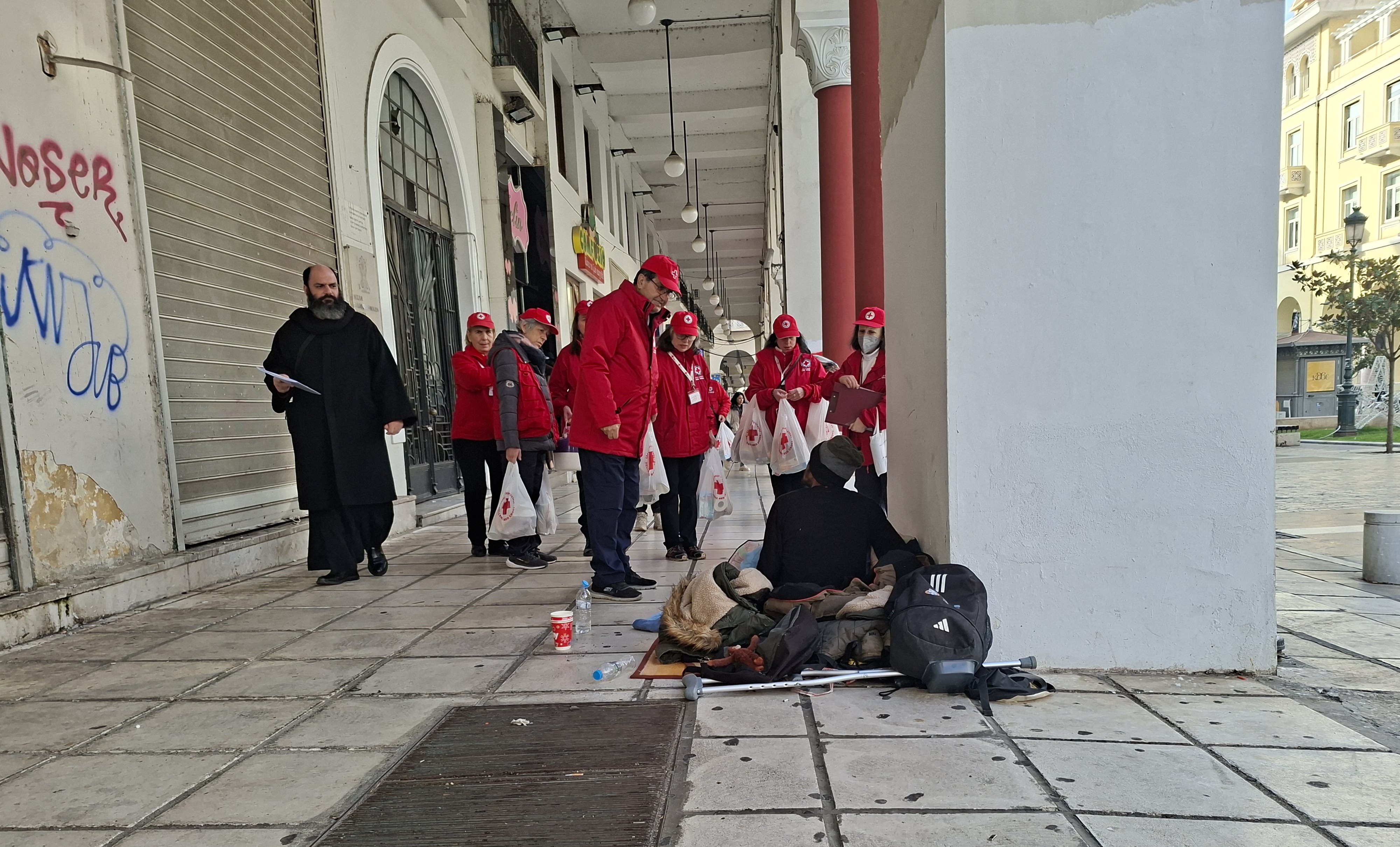 Πρωί Τετάρτης, παραμονές εορτών, στο κέντρο της στολισμένης Θεσσαλονίκης, δύο άνδρες της Δημοτικής Αστυνομίας πλησιάζουν έναν άνδρα που κάθεται με τα λιγοστά του υπάρχοντα σε μια από τις κολόνες στις καμάρες της πλατείας Αριστοτέλους. Οι ένστολοι, που σκοπεύουν να του ζητήσουν να απομακρυνθεί, κοντοστέκονται και παραμερίζουν, όταν τους προλαβαίνει το κλιμάκιο του Ελληνικού Ερυθρού Σταυρού, που τον προσεγγίζει πρώτο.