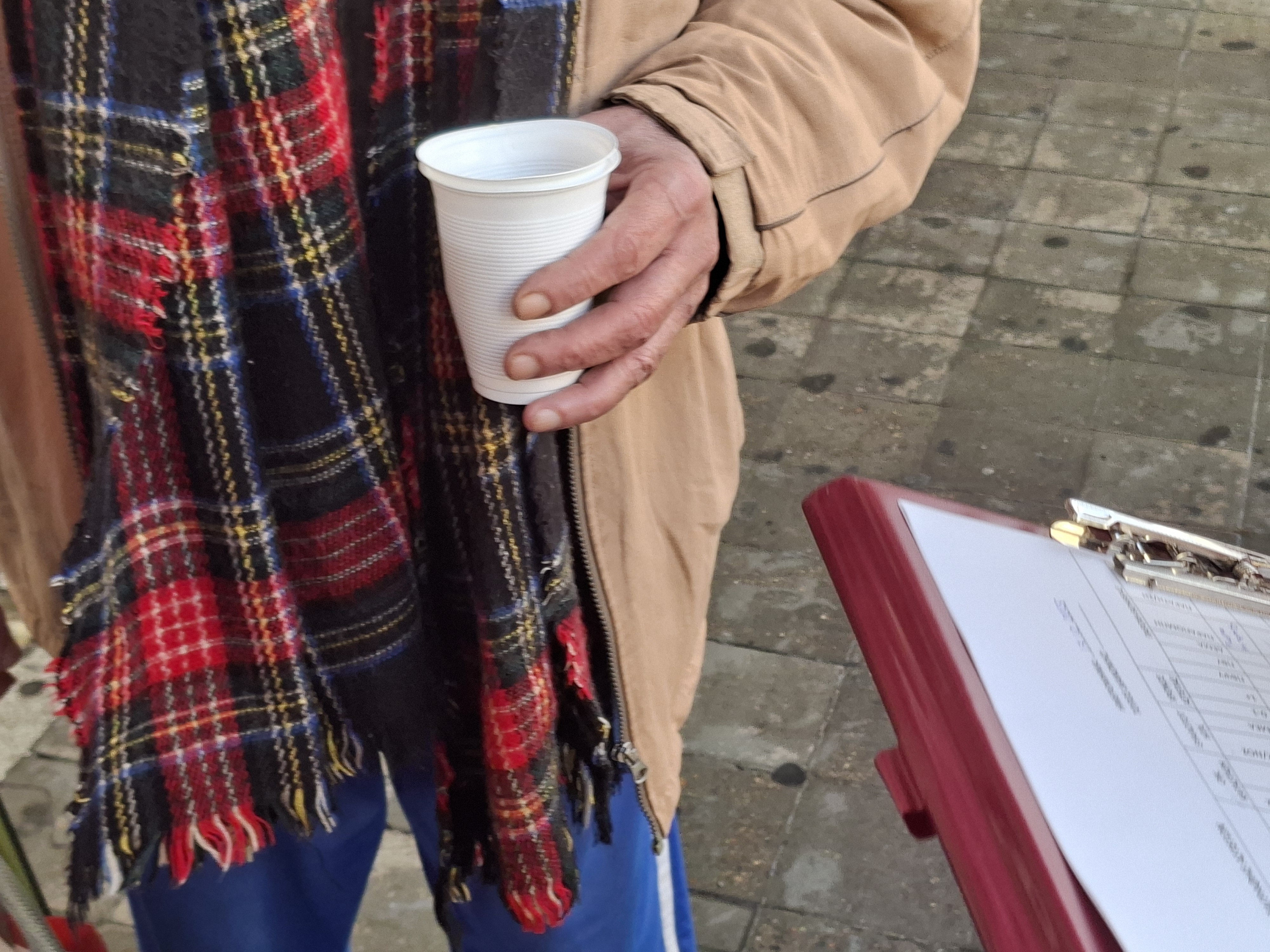 Ο κ. Κώστας, άστεγος τον τελευταίο ένα χρόνο, αναγνωρίζει τους εθελοντές με τα κόκκινα μπουφάν, δέχεται χαμογελαστός το ζεστό τσάι και τη σακούλα με τρόφιμα που του προσφέρουν, τους ευχαριστεί και τους εύχεται καλά Χριστούγεννα. Σε λίγο θα αναγκαστεί να μαζέψει από το πεζοδρόμιο τις κουβέρτες, το μπουφάν και την πατερίτσα του και να αναζητήσει αλλού το επόμενο στέκι, μακριά από τη λαμπερή "βιτρίνα" της πόλης.