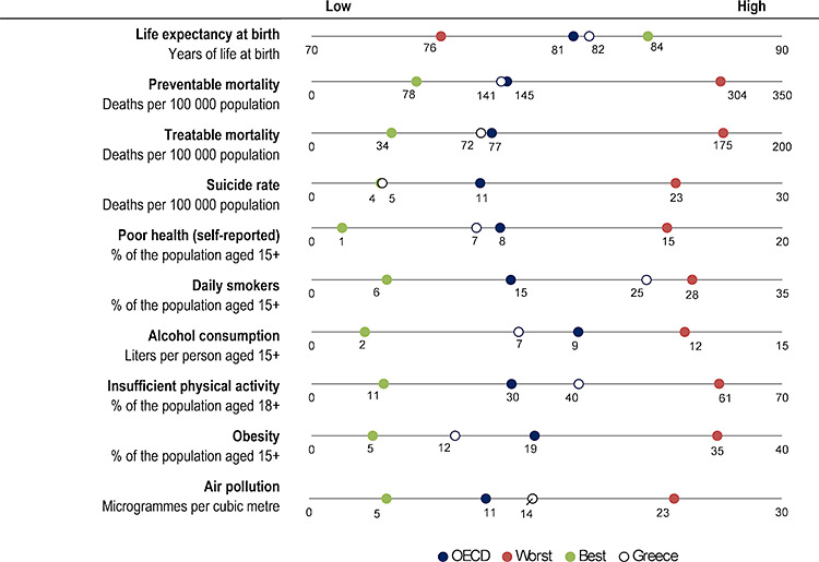 Η προλαμβανόμενη θνησιμότητα ήταν 141 ανά 100.000 στην Ελλάδα (χαμηλότερη από τον μέσο όρο του ΟΟΣΑ που είναι 145), ενώ η θεραπεύσιμη θνησιμότητα ήταν 72 ανά 100.000 (χαμηλότερη από τον μέσο όρο του ΟΟΣΑ που είναι 77).
