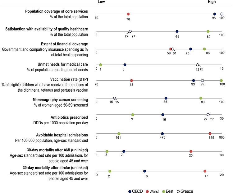 Στην Ελλάδα, όλος ο πληθυσμός καλύπτεται για ένα βασικό σύνολο υπηρεσιών, ενώ το 98% του πληθυσμού καλύπτεται κατά μέσο όρο στις χώρες του ΟΟΣΑ.