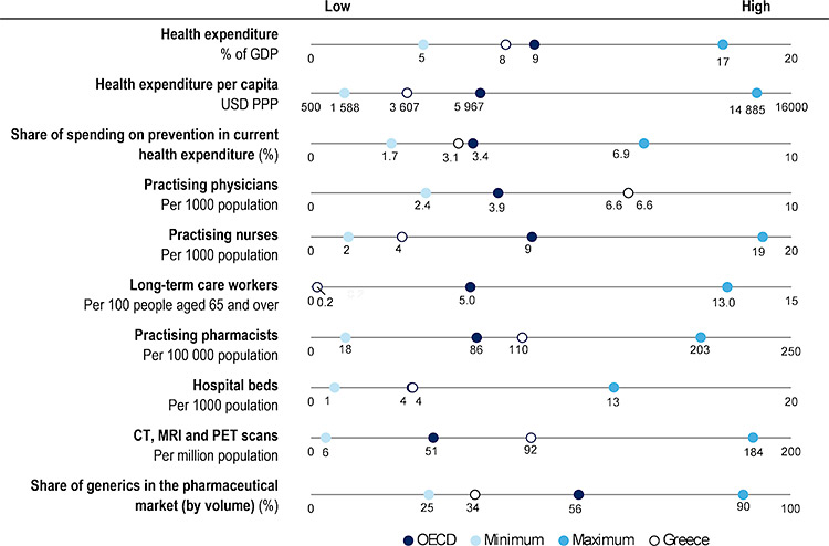 Στην Ελλάδα υπάρχουν 6,6 αδειούχοι γιατροί ανά 1.000 κατοίκους (μέσος όρος ΟΟΣΑ 3,9 ασκούμενοι γιατροί) και 3,8 ασκούμενοι νοσηλευτές (μέσος όρος ΟΟΣΑ 9,2).