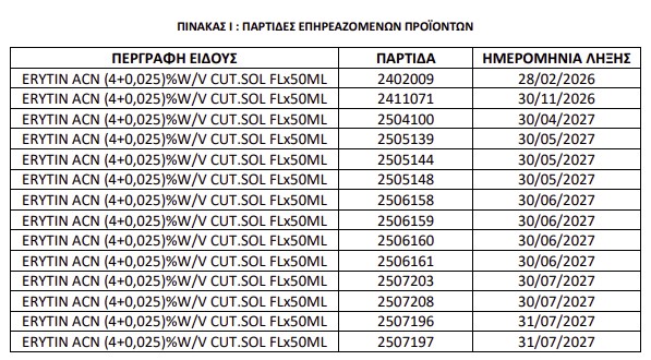 Αποφασίζουμε την ανάκληση των παρτίδων του φαρμακευτικού προϊόντος ERYTIN ACN (4+0.025)%W/V CUT.SOL του συνημμένου πίνακα Ι, που περιέχουν τη δραστική α’ ύλη Erythromycin παραγωγής του εργοστασίου SM BIOMED SDN BHD Μαλαισίας, λόγω ανάκλησης του Πιστοποιητικού CEP του παραγωγού.