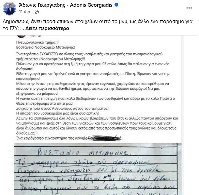 Στις αρχές του περασμένου Σεπτεμβρίου ο υπουργός Υγείας, Άδωνις Γεωργιάδης, επαίνεσε δημόσια τους γιατρούς του Πνευμονολογικού Τμήματος του Βοστάνειου νοσοκομείου Μυτιλήνης, που έδωσαν αγώνα για να κρατήσουν στη ζωή μια υπερήλικη ασθενή, 95 ετών και τα κατάφεραν. Αναδημοσίευσε το χειρόγραφο ευχαριστήριο της ίδιας της ασθενούς που είχε δημοσιεύσει η εγγονή της, και χαρακτήρισε το συγκεκριμένο περιστατικό ως "άλλο ένα παράσημο για το ΕΣΥ".