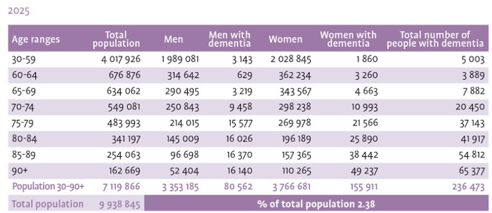 Σύμφωνα με τους συντάκτες της έκθεσης, οι γυναίκες επηρεάζονται δυσανάλογα, αποτελώντας περίπου τα δύο τρίτα όλων των περιστατικών. Το χάσμα διευρύνεται στις μεγαλύτερες ηλικίες, καθώς οι γυναίκες ζουν περισσότερο.