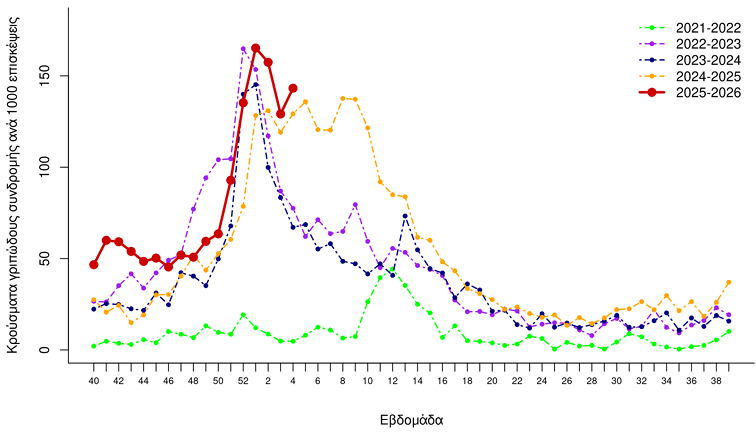Οι υπεύθυνοι του ΕΟΔΥ επισημαίνουν πως την προηγούμενη εβδομάδα καταγράφηκε μικρή αύξηση στις επισκέψεις σε γιατρούς ασθενών με γριπώδη συνδρομή (βλ. γράφημα).