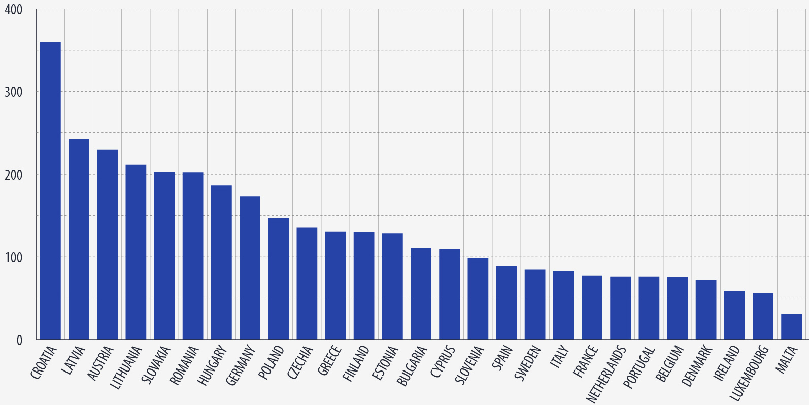 Τις περισσότερες νοσηλείες ασθενών με καρκίνο του πεπτικού έχει μακρά η Κροατία (359,97 ανά 100.000) και τις λιγότερες η Μάλτα (30,94).