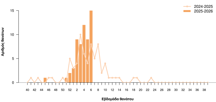 Ομοιότητες έχει η τρέχουσα περίοδος της γρίπης με την αντίστοιχη περυσινή. Την περίοδο 2024 - 2025, η κορύφωση της επιδημίας είχε καταγραφεί τη δεύτερη εβδομάδα (6 - 12 Ιανουαρίου), ενώ το ίδιο συνέβη και φέτος.
