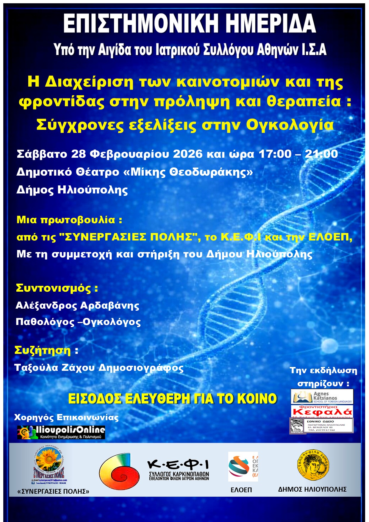 Οι «Συνεργασίες πόλης», (13 κοινωνικοί Συλλογικοί φορείς της Ηλιούπολης), ο Σύλλογος Καρκινοπαθών, Εθελοντών, Φίλων, Ιατρών «Κ.Ε.Φ.Ι.» Αθηνών και η ΕΛΟΕΠ, με τη συμμετοχή και στήριξη του Δήμου Ηλιούπολης, διοργανώνουν Επιστημονική Εσπερίδα με θέμα «Η Διαχείριση των καινοτομιών και της φροντίδας στην πρόληψη και θεραπεία : Σύγχρονες εξελίξεις στην Ογκολογία», η οποία θα πραγματοποιηθεί το Σάββατο 28 Φεβρουαρίου 2026 και ώρα 17:00 – 21:00 στο Δημοτικό Θέατρο «Μίκης Θεοδωράκης» του Δήμου Ηλιούπολης.