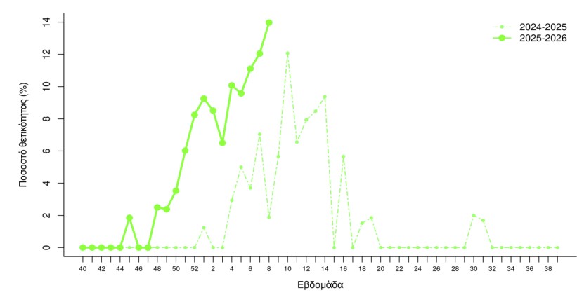 Συγκεκριμένα, η θετικότητα RSV στην κοινότητα (δίκτυο επιτήρησης Sentinel ΠΦΥ) παρουσίασε αύξηση σε σχέση με την προηγούμενη εβδομάδα, χωρίς ωστόσο να ξεπεράσει τη μέγιστη θετικότητα που έχει καταγραφεί την τρέχουσα περίοδο επιτήρησης. Η θετικότητα από τα νοσοκομεία του δικτύου επιτήρησης SARI συνεχίζει την ανοδική τάση.
