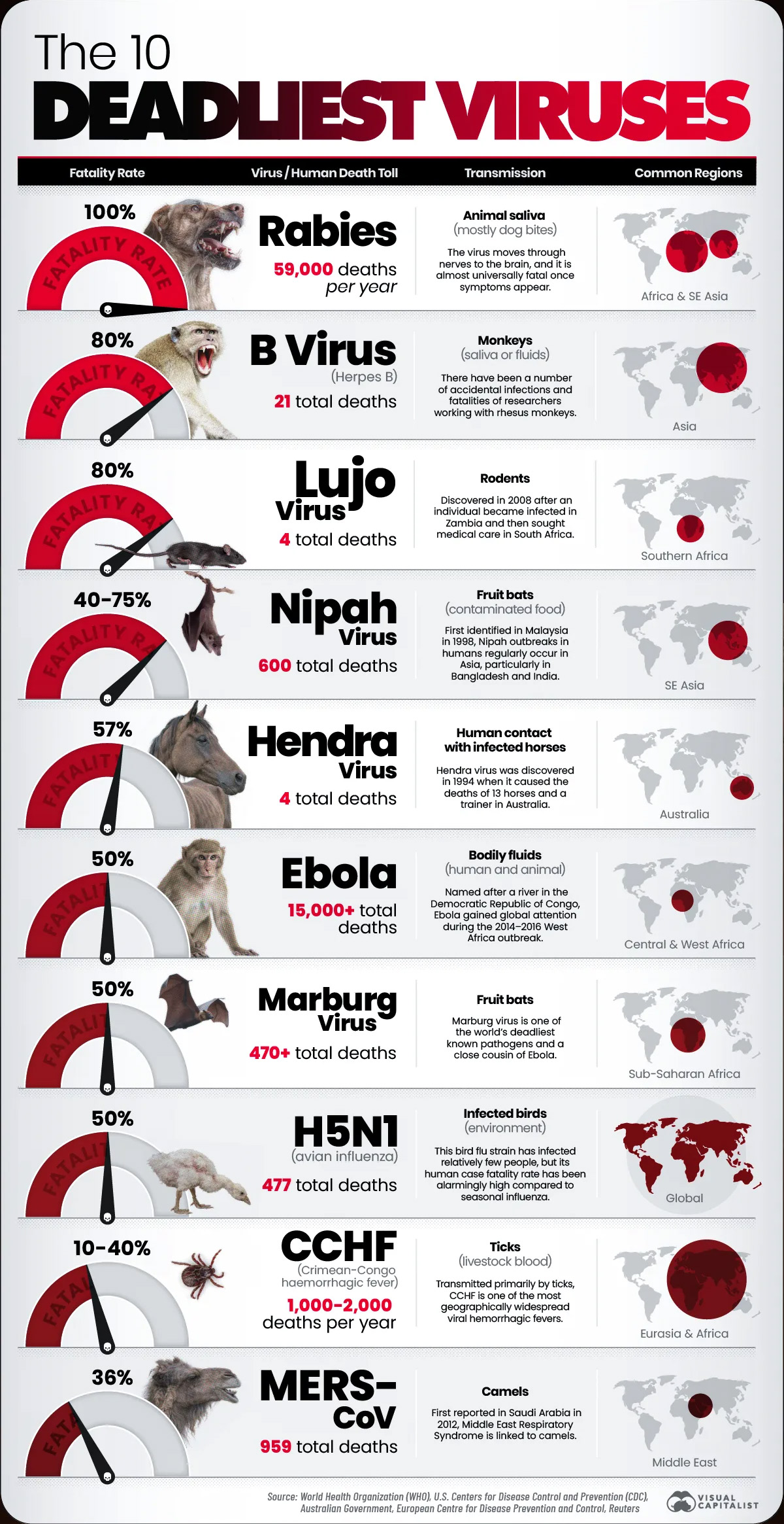 Οι περισσότεροι από τους πιο θανατηφόρους ιούς στον κόσμο προέρχονται από ζώα, όπως νυχτερίδες, τρωκτικά, καμήλες και πουλιά. Μερικοί ιοί μολύνουν εκατομμύρια ανθρώπους, αλλά σκοτώνουν σχετικά λίγους. Άλλοι εξαπλώνονται λιγότερο, αλλά αποδεικνύονται πολύ πιο θανατηφόροι μόλις μολύνουν τους ανθρώπους.