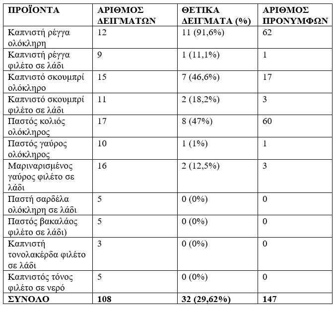 Όπως καταγράφεται στον παρακάτω πίνακα, τα μεγαλύτερα ποσοστά θετικών δειγμάτων εμφάνισαν τα προϊόντα ρέγγας, σκουμπριού, κολιού και γαύρου, ενώ στη μέση ένταση μόλυνσης (μέσος αριθμός προνυμφών ανά δείγμα) υπερίσχυσαν ο κολιός, η ρέγγα και το σκουμπρί.