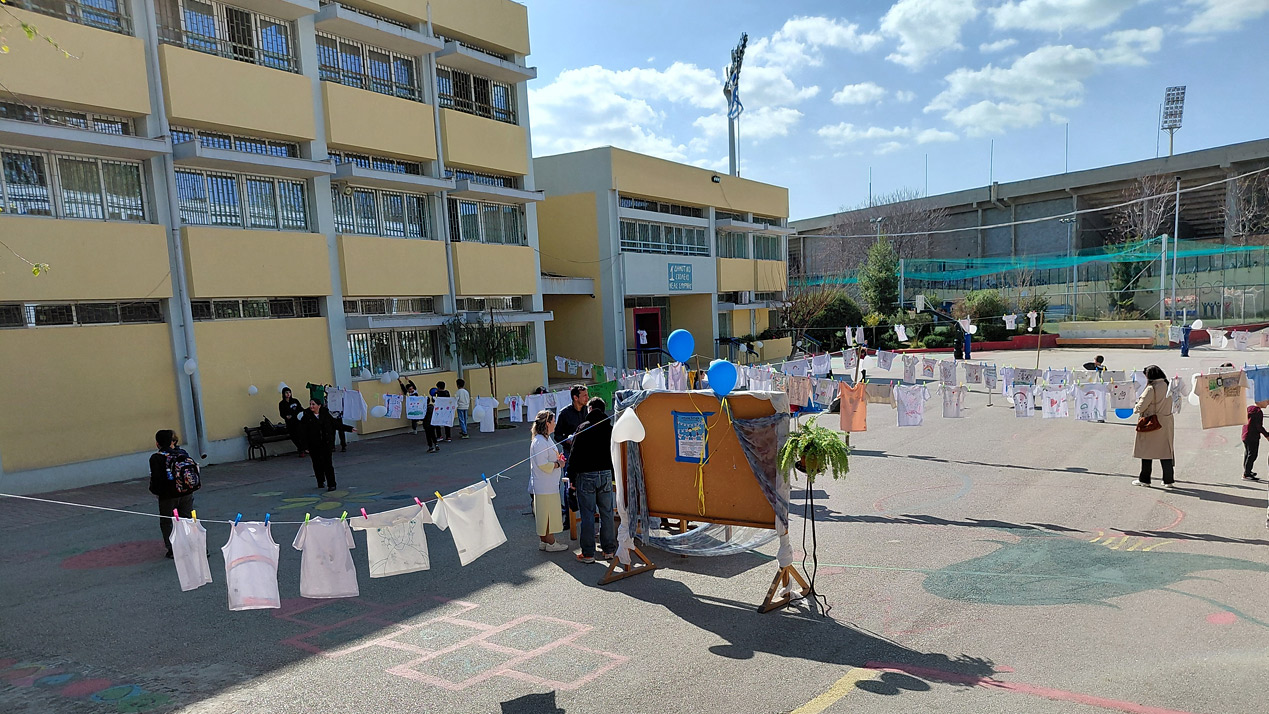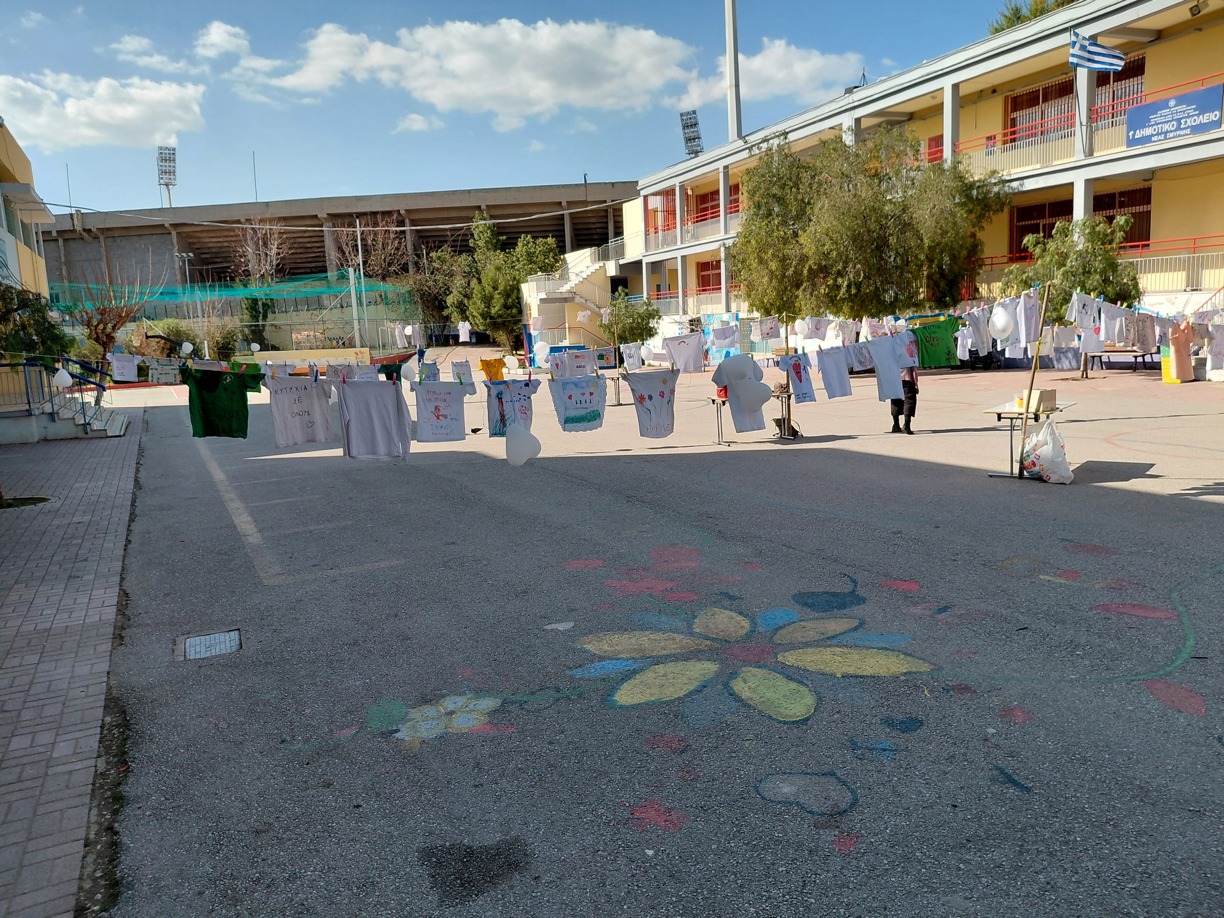 Με μια πολύ ενδιαφέρουσα και όμορφη πρωτοβουλία, τα παιδιά του 1ου Δημοτικού σχολείου Νέας Σμύρνης δημιούργησαν και εξέθεσαν ζωγραφιές σε δεκάδες φανελάκια και μπλουζάκια στον προαύλιο χώρο του σχολείου, σε μια προσπάθεια ενίσχυσης των παιδιών του συλλόγου Γονιών Παιδιών με Νεοπλασματική Ασθένεια "Η Φλόγα", ένας σύλλογος που ιδρύθηκε το 1982 από γονείς παιδιών με καρκίνο.