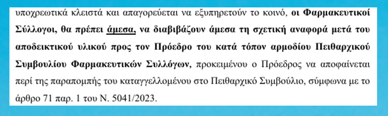 "Στην περίπτωση που εν προκειμένω, υποπίπτει στην αντίληψή τους ότι φαρμακεία που δεν εφημερεύουν, και ως εκ τούτου θα πρέπει να μην λειτουργούν, κάνουν χρήση των εν λόγω πλατφόρμων διάθεσης προϊόντων προκειμένου, παρανόμως, να προβαίνουν σε διάθεση προϊόντων τους κατά τις ημέρες και ώρες που είναι υποχρεωτικά κλειστά και απαγορεύεται να εξυπηρετούν το κοινό, οι Φαρμακευτικοί Σύλλογοι, θα πρέπει άμεσα, να διαβιβάζουν άμεσα τη σχετική αναφορά μετά του αποδεικτικού υλικού προς τον πρόεδρο του κατά τόπον αρμοδίου Πειθαρχικού Συμβουλίου Φαρμακευτικών Συλλόγων, προκειμένου ο πρόεδρος να αποφαίνεται περί της παραπομπής του καταγγελλομένου στο Πειθαρχικό Συμβούλιο".