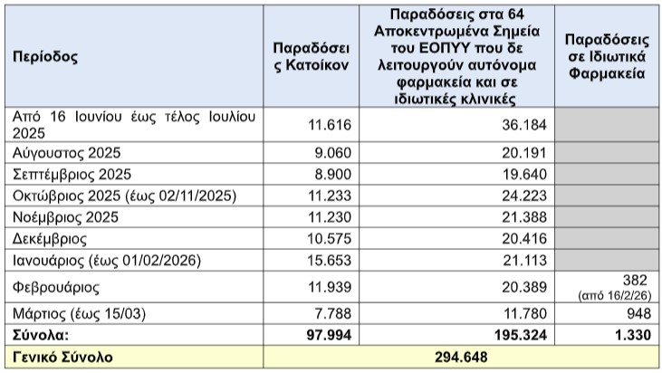 Από τις 16 Ιουνίου 2025 έως τις 15 Μαρτίου 2026, έχουν ικανοποιηθει συνολικά 294.648 αιτήματα ασθενών για κατ΄οίκον παράδοση φαρμάκων υψηλού κόστους (ΦΥΚ).