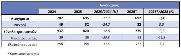 Από τα παθόντα πρόσωπα των οδικών τροχαίων ατυχημάτων, καταγράφηκαν 32 νεκροί, 23 βαριά τραυματίες και 752 ελαφρά τραυματίες, έναντι 32 νεκρών, 26 βαριά τραυματιών και 794 ελαφρά τραυματιών τον Ιανουάριο του 2025, παρουσιάζοντας καμία μεταβολή σε νεκρούς, μείωση κατά 11,5% σε βαριά τραυματίες και κατά 5,3% σε ελαφρά τραυματίες.