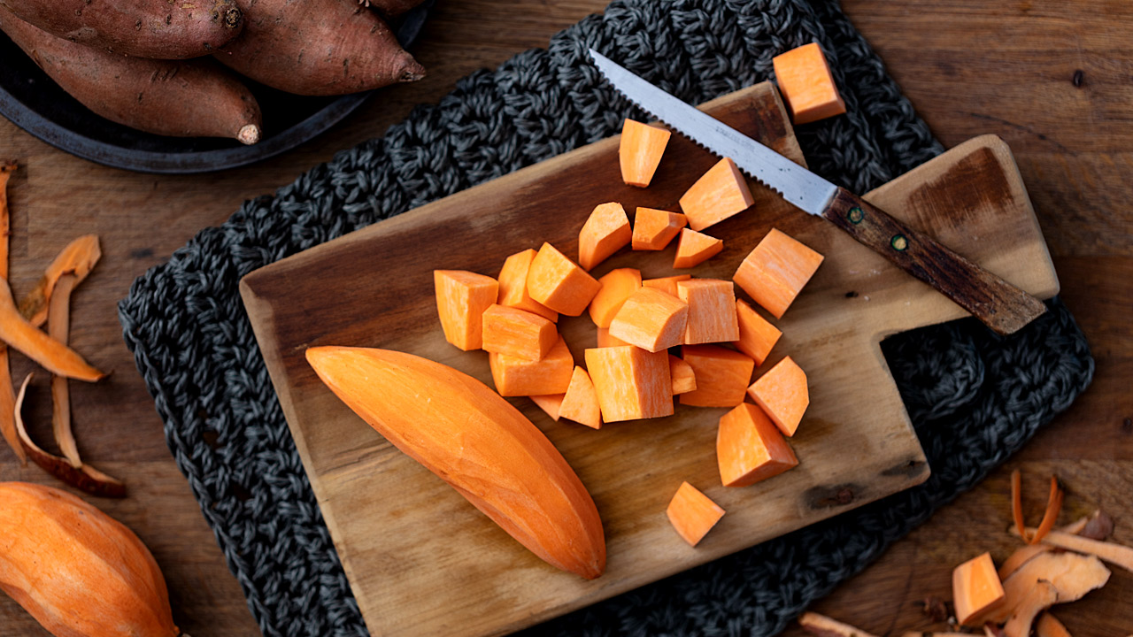 Σε μία κατσαρόλα ζεσταίνουμε λίγο ελαιόλαδο και βάζουμε 500 γρ. γλυκοπατάτες κομμένες σε κύβους, 1 κομμάτι ginger ίσο με 2 δάχτυλα ψιλοτριμμένο, 1 κομμάτι κουρκουμά ίσο με 1 δάχτυλο ψιλοτριμμένο (βλ. tips), 1 στέλεχος λεμονόχορτο ελαφρώς κοπανισμένο με τη λάμα ενός μαχαιριού και κομμένο σε 4 κομμάτια και ½ κ.γλ. μπούκοβο. Σοτάρουμε για λίγο μέχρι να μυρίσουν τα μπαχαρικά, ανακατεύοντας με ξύλινη κουτάλα. Προσθέτουμε ένα ολόκληρο ξερό κρεμμύδι στο οποίο έχουμε καρφώσει 3 γαρύφαλλα, αλατοπιπερώνουμε και σκεπάζουμε με σπιτικό ζωμό λαχανικών ή νερό. Βράζουμε σε μέτρια φωτιά μέχρι να μαλακώσουν οι γλυκοπατάτες.