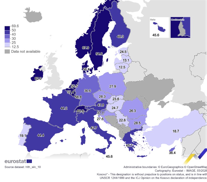 Όπως προκύπτει από την έκθεση, περισσότερο από τα δύο τρίτα (68,5%) του πληθυσμού της ΕΕ αξιολόγησε το 2024 την υγεία του πολύ καλή ή καλή.