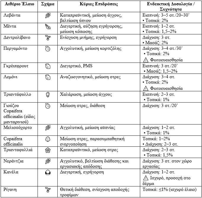 Για παράδειγμα, η λεβάντα έχει κυρίως καταπραϋντική και αγχολυτική δράση, ενώ έλαια όπως η μέντα, το δεντρολίβανο και τα εσπεριδοειδή ενισχύουν την εγρήγορση και την γνωστική απόδοση.