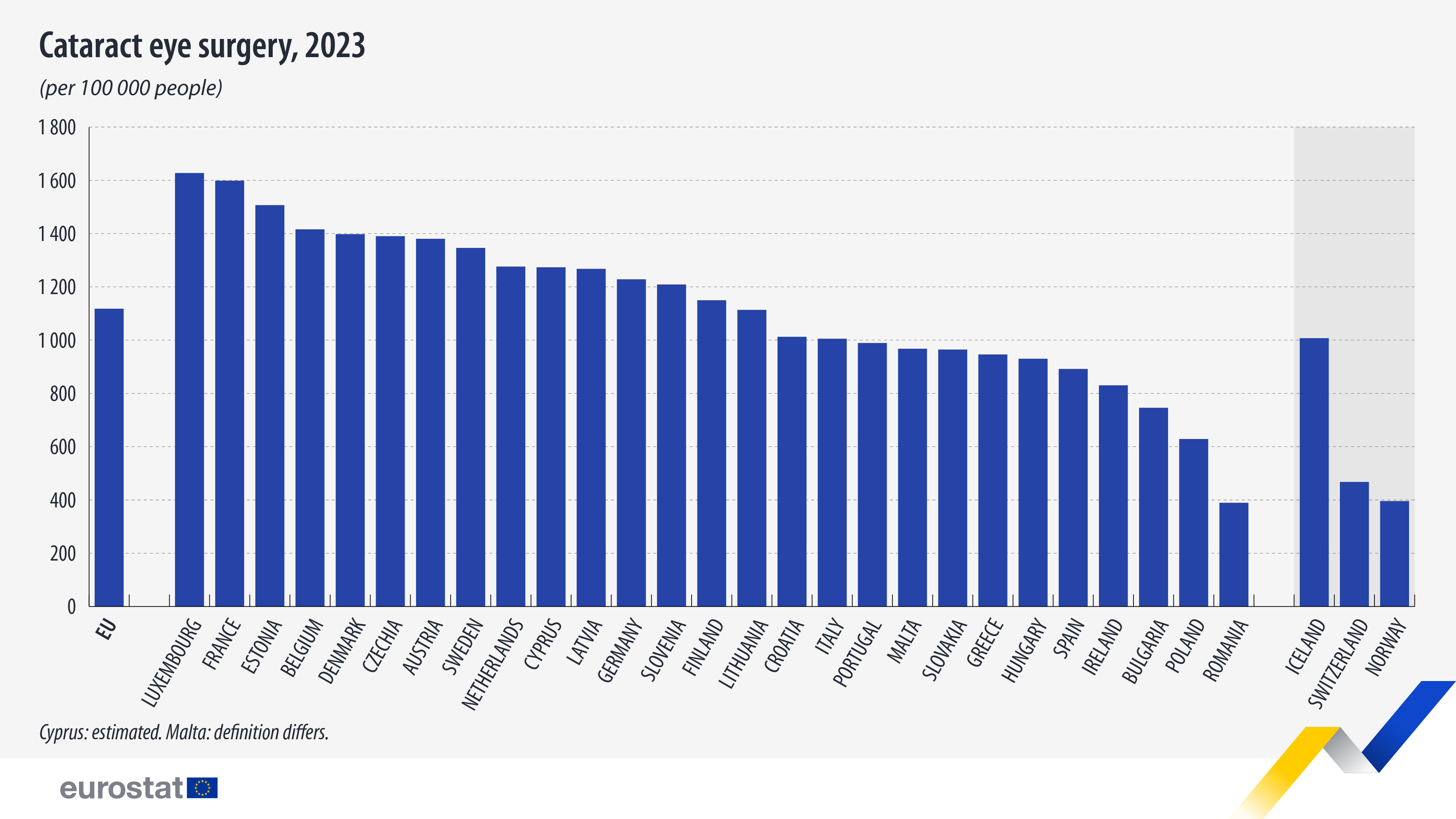 Σύμφωνα με τους συντάκτες της έκθεσης, η χειρουργική επέμβαση καταρράκτη, η οποία περιλαμβάνει την εξαγωγή του φακού από το μάτι, πραγματοποιήθηκε λίγο πάνω από 5 εκατομμύρια φορές στην ΕΕ το 2023. Αυτό αντιστοιχεί σε ποσοστό 1.118 χειρουργικών επεμβάσεων ανά 100 000 άτομα.
